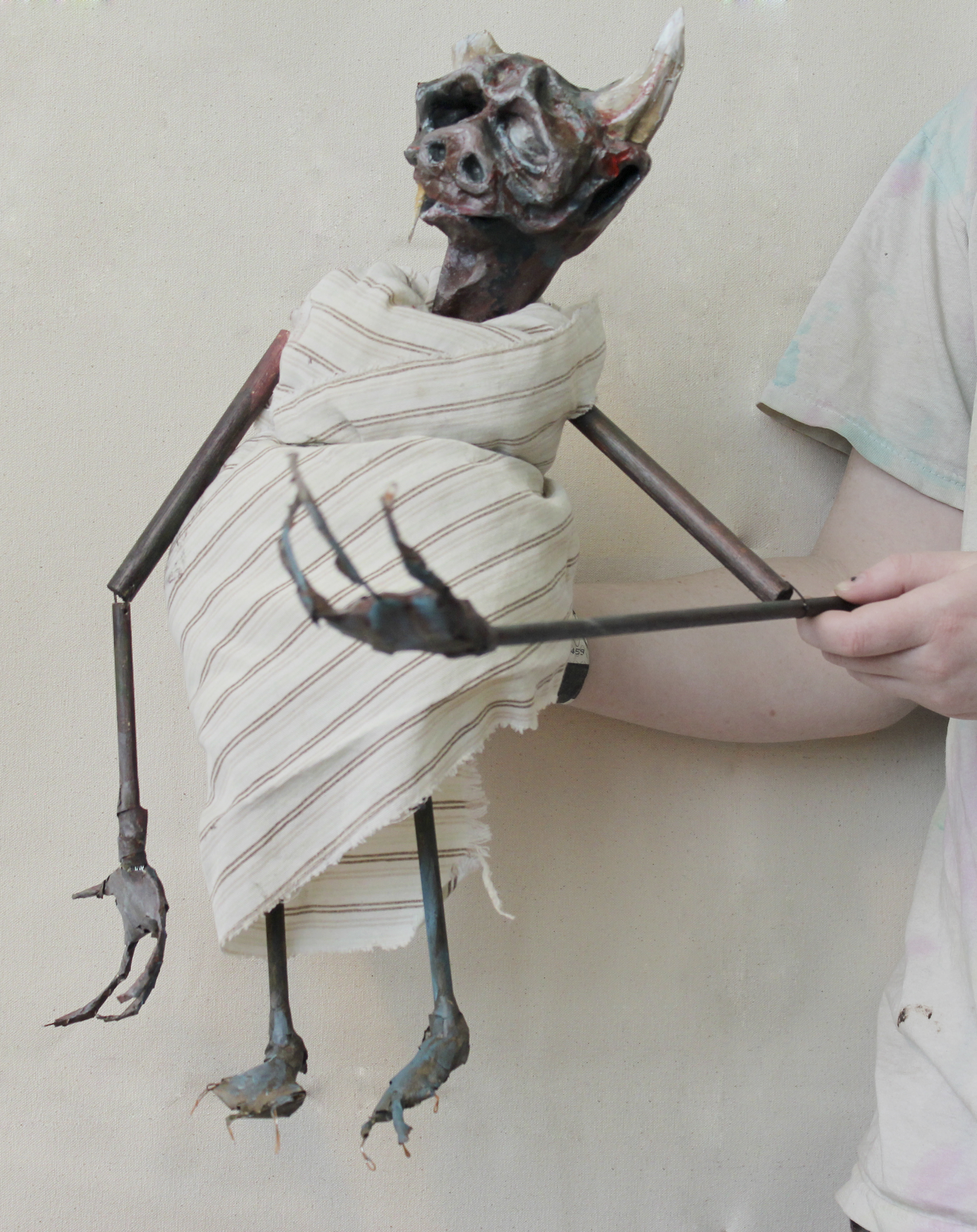 paper mache, wood, wire, acrylic paint, fabric
